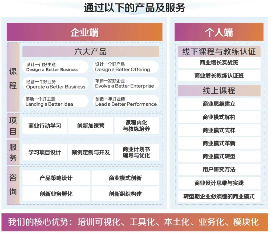 1. 以【设计一门好生意】为核心的六大产品:针对处于业务生命周期中不同阶段的业务团队所需的不同能力,精心设计的六大内训课程产品,旨在帮助团队提升解决不同问题的能力,在实践中促进业务增长;