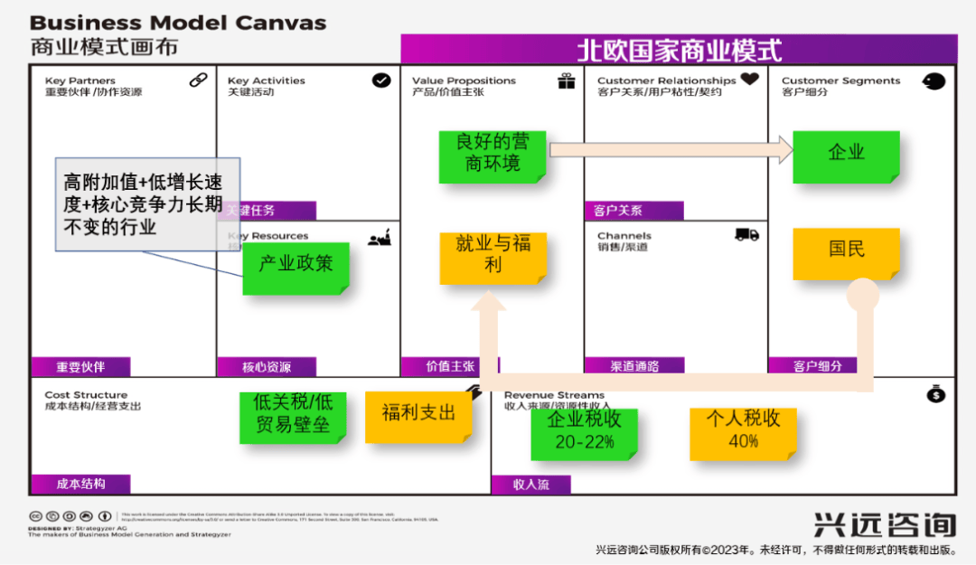 这个模式中,北欧国家比较利用自身的长期积累的核心能力,重点聚焦在高附加值+低增长速度+核心竞争力长期不变的行业,通过给企业通过良好的营商环境,给国民提供充分就业与福利,获取企业20-22%的税收,个人40%的税收,提供国民高福利。这个模式有以下几个关键特点:(资料来源:北欧模式-百度百科)