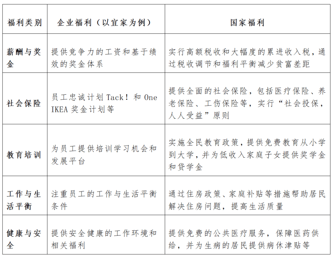 宜家在不同国家,遵守当地的法律,以北欧国家为例,员工福利包括企业福利+国家福利,以下是以表格形式呈现的宜家和国家福利的对比,包括以下内容: