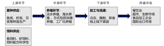中国水产养殖产业链分为上游、中游和下游,涵盖苗种、饲料供应、养殖、加工、销售等多个环节。近年来,伴随市场需求的提升和技术的发展,产业链的整合和龙头企业的崛起尤为显著。图1中国水产养殖产业链。