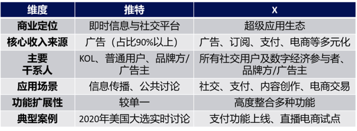 推特与X在商业定位、核心收入来源、主要干系人、应用场景及功能扩张性上有着显著区别。具体如图2所示。