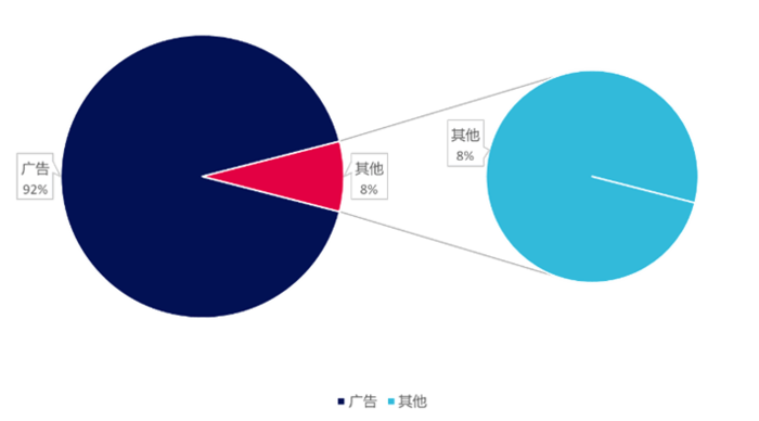盈利模式单一,广告依赖度高。推特90%以上的收入来源于广告,但广告收入高度依赖活跃用户数和用户参与度。随着用户增长放缓,广告客户的预算开始向其他平台倾斜。而在广告形式上,推特无法与Instagram的视觉广告或YouTube的视频广告竞争,其文字型广告点击率和转化率较低。2021年财报数据,全年收入为50.8亿美元,其中广告收入占92%,但广告营收增速(22%)低于行业平均(33%)。如图3所示2021年广告收占比。