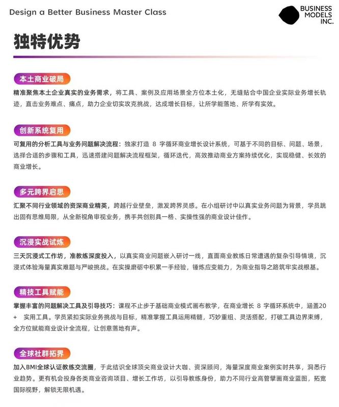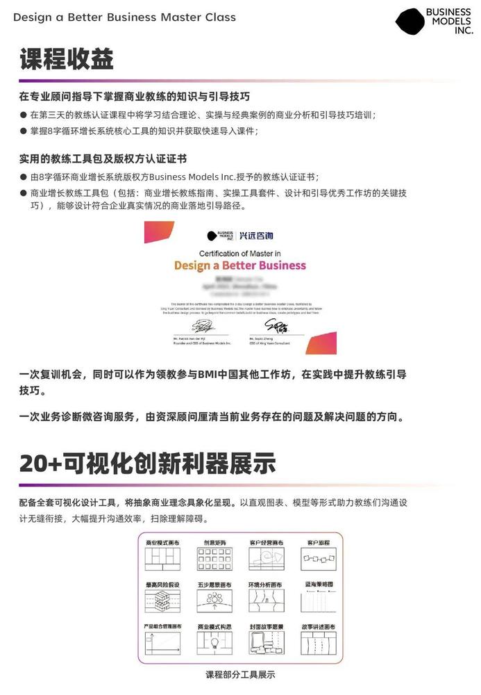 ● Design a Better Business Master Class设计一门好生意大师班认证教练有机会参与BMI中国项目策划及交付;