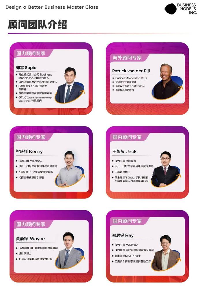 BMI中国致力于培养一群能够通过设计方法论与商业逻辑的结合,创造以用户为中心的可持续解决方案的商业设计师,用商业设计的方式解决商业问题。我们相信解决企业的业务难题,一定是先通过诊断找到“病因”,再通过各种工具与方法去“设计并验证”、“治疗方案”,而不是只靠单一的某种工具作为“药方”试图解决所有问题。