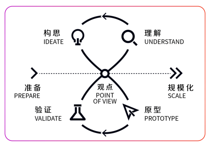 因此,能够基于当前环境现状(需要转变增长逻辑,从生产端转向消费端),同时与企业自身资源现状相结合(打破资源错配,优化资源结构)的方法与工具,一直是我们Business Models Inc.(BMI)研究的重点方向。Business Models Inc.(BMI)在深入的商业设计实践中,提炼出了商业增长的8字循环系统(Double Loop)。这一系统以设计思维为基石,以实现规模化增长为核心目标,从准备阶段着手,通过观点建立、现状理解、未来构思、原型构建和假设验证的循环过程,将商业设计转变为一个有逻辑、有深度、有工具支撑的高效流程。