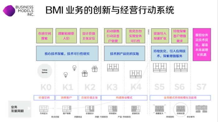 另外,跟进策略也是可以的,也是比较轻松的,但是当我们已经走到行业份额里面第一、第二名的时候,你就不见得能够轻易完成。所以,在构建创新系统的时候,要包括流程、管制架构、财务支持以及产业团队。这意味着在实际业务中,如果我们不能系统化地建设,公司内部可能会有很多障碍来阻碍你的业务。所有的流程如果按照刚刚的K曲线来看,你会发现,我们所需要的创意探索,里面包括洞察客户目标、概念验证和价值原型,还有试运营和增长设计,以及最终的优化。这构成了一套完整的系统。你会发现我们的活动非常多样,这是因为我们有明确的目标,希望在管制和创新方面都达到一定的标准,同时在执行过程中需要完成许多任务。
