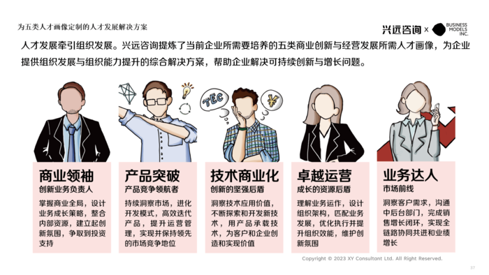 因此,这里就可以看到,我们为他们提供能力培育,包括执行力、洞察力、增长能力和战略能力等。我们会根据公司内部的管理层级来进行对应的赋能,并且我们称之为商业及创新能力培训体系。这是一个正式的产品,非常有趣。如有需要,可以与我们的团队联系。