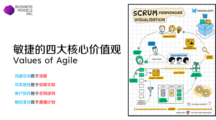 我们会看到敏捷很有趣,因为敏捷改变了我们过去的一些习惯。敏捷强调互动性、可实现性、客户协作性以及相关性,与传统公司的流程框架完全不同。这个地方其实是需要独立出来,怎么做到呢?稍后我会告诉大家我们在什么时间做以及如何准备的。