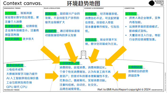 在整体的环境趋势中,我们可以看到明显变化。许多企业开始研究逐渐减少车辆使用规模,但更注重的是商用和客货的两用需求。国企规模正在扩大,这是一个机会。当政策方向转向鼓励新兴业务发展时,国家不再支持低生产效率的业务,而是支持规模扩大的业务。也有一些法规会对汽车行业产生影响,包括排放标准的推动以及能源结构的改变。在经济趋势方面,我们的经济增速放缓、可支配财富以及就业环境并不乐观。然而,在数字化的环境中,越来越多跨界企业正在进入我们的汽车行业。同时,也有更多新营销和服务架构、大量资本注入以及行业结构在发生变化等,竞争状态加剧。从技术领域来看,三电技术成熟、大数据的深度学习能力、AI以及工业互联网、GPU正在取代CPU等。当然,还有一些不确定因素。很多地方都在积极行动。