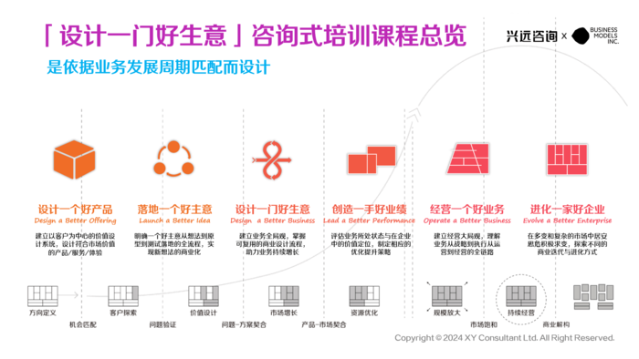 前面属于能力赋能,而我们的重点是做业务赋能。因为我们是做咨询式培训的,所谓的咨询式培训就是我们的咨询服务是以培训的方法来提供一套完整的产品服务。所以我们会有「设计一个好产品」、「落地一个好主意」、「设计一门好生意」、「创造一手好业绩」、「经营一个好业务」、以及「进化一家好企业」。