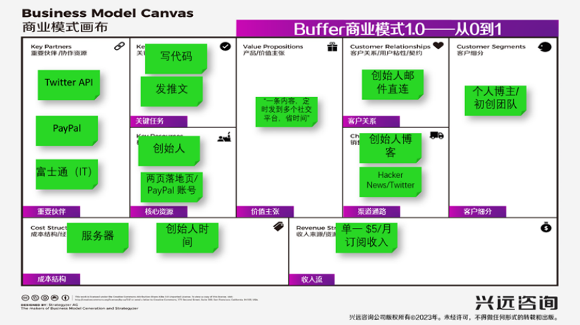 Buffer以其独特的成长路径和商业模式成为行业佳话。下面我们分析如何这家公司如何从创始人个人需求出发、以两页网站为起点,用MVP(最小可行产品)验证了市场的真实渴望,更通过持续优化商业模式,在竞争激烈的赛道中站稳脚跟的。成为全球数百万用户信赖的品牌。其发展旅程,堪称“小步快跑、快速迭代”与“商业模式精准落地”相结合的典范。我们用BMI兴远咨询的MVP模型和商业模式画布,分析Buffer的发展。