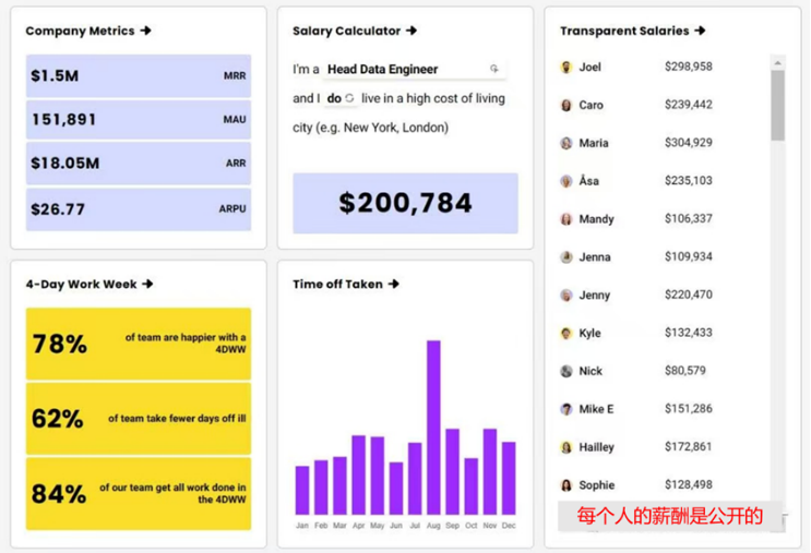 ● 极致透明化:从2013年起,Buffer公开所有员工薪资(如图所示)、股权结构、月度营收甚至失败案例(如某次功能迭代的用户流失数据)。这种“激进透明”不仅降低了用户信任成本,还吸引了认同其价值观的人才加入,间接降低了招聘和品牌营销费用;