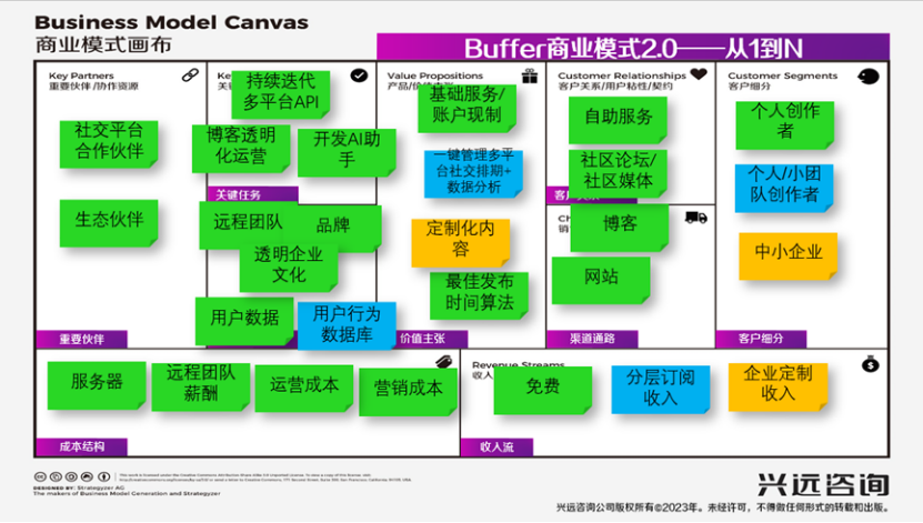在1.0基础上,Buffer把“定时发布”这一单点功能升级为完整的价值主张:一站式社媒管理+数据洞察,匹配更宽泛的客户细分。收入模式从单一订阅演进为“免费增值+多层订阅+企业定制”,在画布上形成多重收入流。如图6所示。