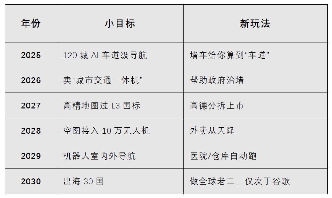 从2025开始到2030年,高德地图要闯过6关,如下表所示: