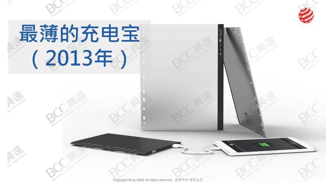 前几天,我正在为这次演讲准备所需的资料,在我打开自己的电脑查看数据时,发现在过去的10年里,有超过100个产品在我的手上被设计出来。2013年,在市场上的移动电源产品普遍体积较大的情况,我设计出了一款全世界最薄的移动电源,并因此获得了红点奖。