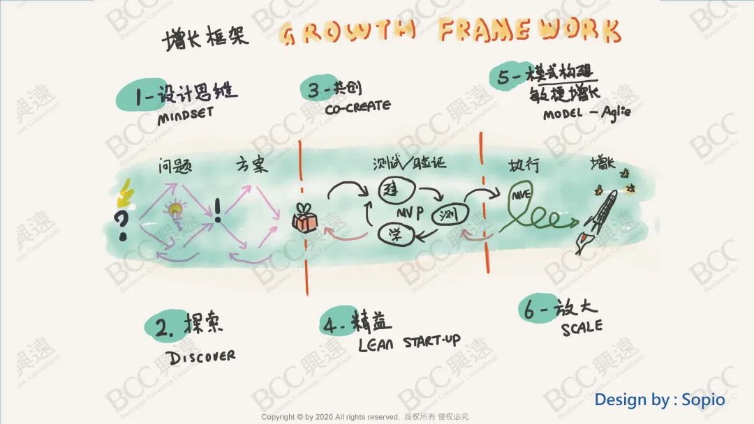 我们所说的设计思维并不是一个简单的双钻模型,或是六步模型就够了,它更多的是需要我们不断重复地去探索,以及思考如何系统的客户互动并确认价值。
